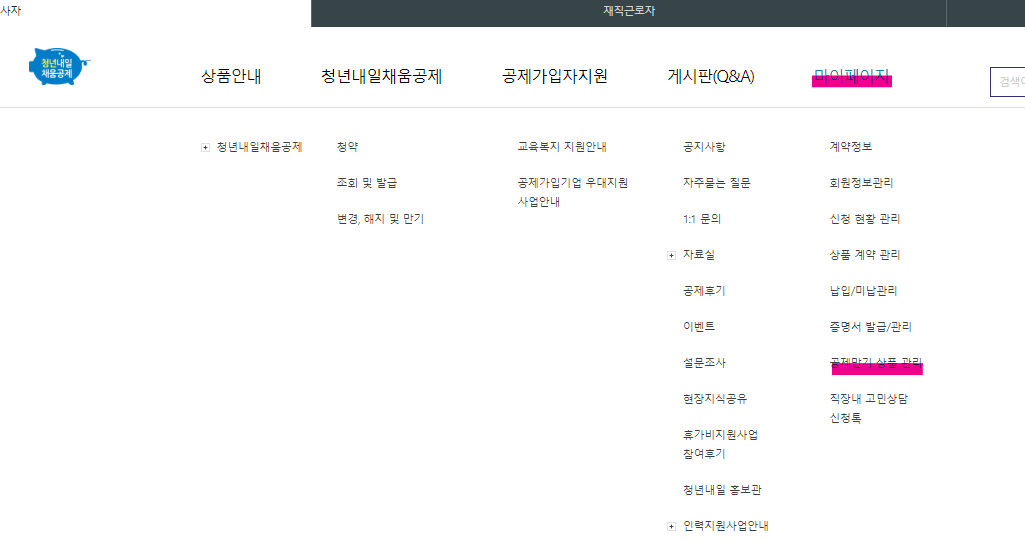 2. [마이페이지 -> 공제만기상품 관리] 메뉴에 접속합니다.