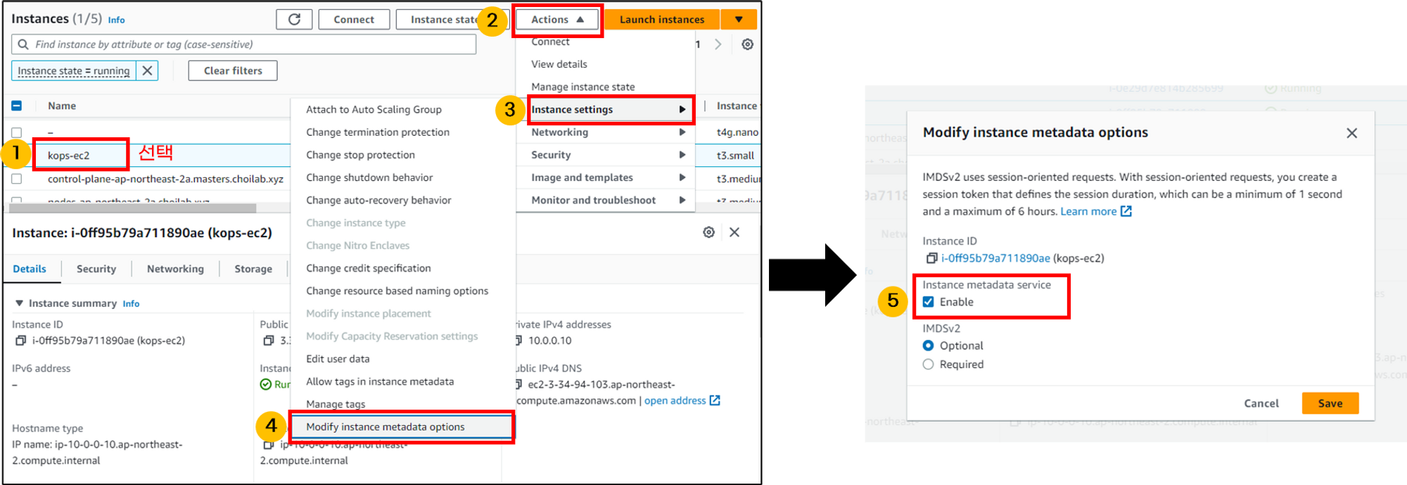 또는 실행 중인 인스턴스 속성에서 메타데이터를 활성화 시킬수도 있습니다.