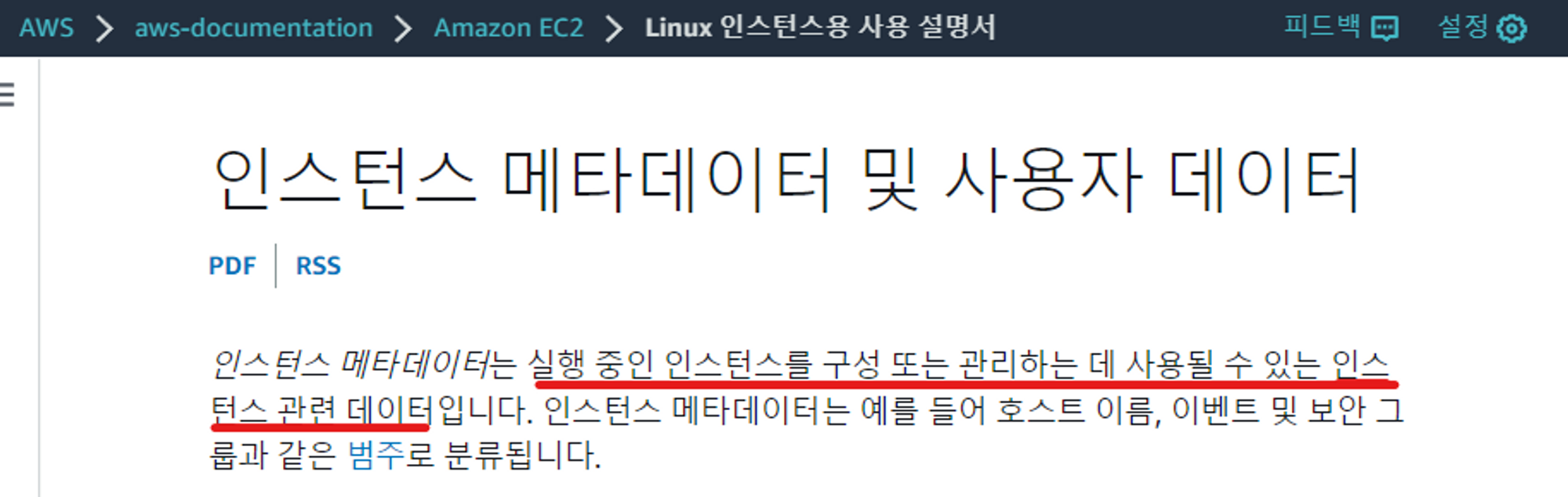 인스턴스 메타데이터는 공식문서에서 소개한 것처럼 실행중인 EC2인스턴스 메타데이터입니다. 예를 들어 ami-id, 호스트 이름 등이 메타데이터에 속합니다.