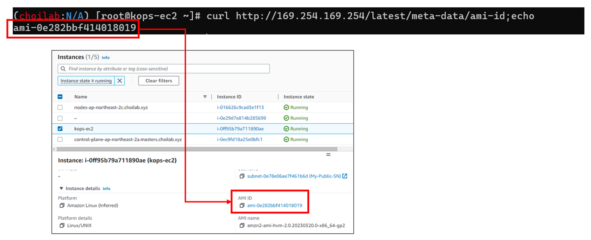 IMDS API를 호출하여 EC2 인스턴스 ami-id를 조회했습니다.
