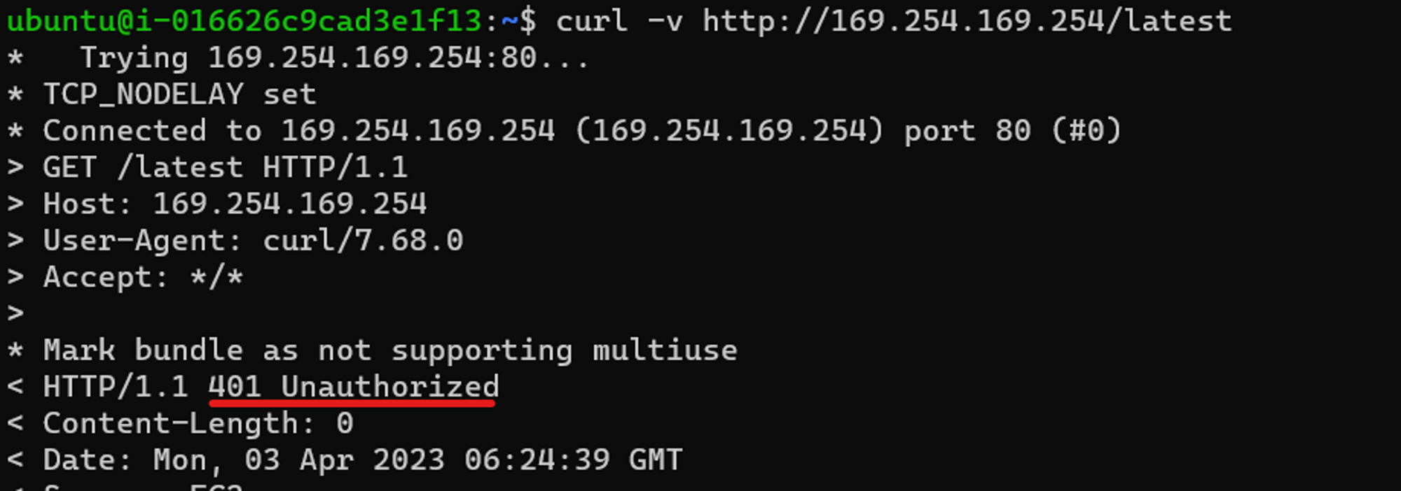 IMDS API v2부터는 적절한 인증정보를 설정해야 합니다. 인증정보를 설정하지 않으면 “401 Unauthorized”에러가 발생합니다. v1 API는 인증정보가 필요하지 않습니다.