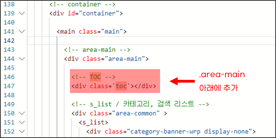 TOC를 화면에 보여주는 코드를 추가합니다. ".area-main"아래에 추가합니다.