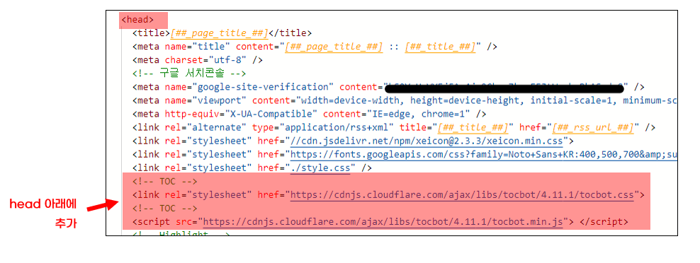 목차 라이브러리(TOC) 설정을 head태그 아래에 추가합니다.