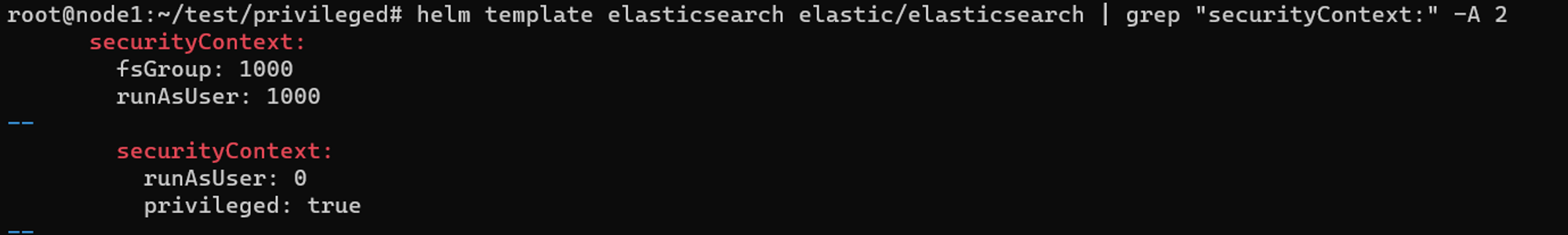 helm template elasticsearch elastic/elasticsearch | grep "securityContext:" -A 2