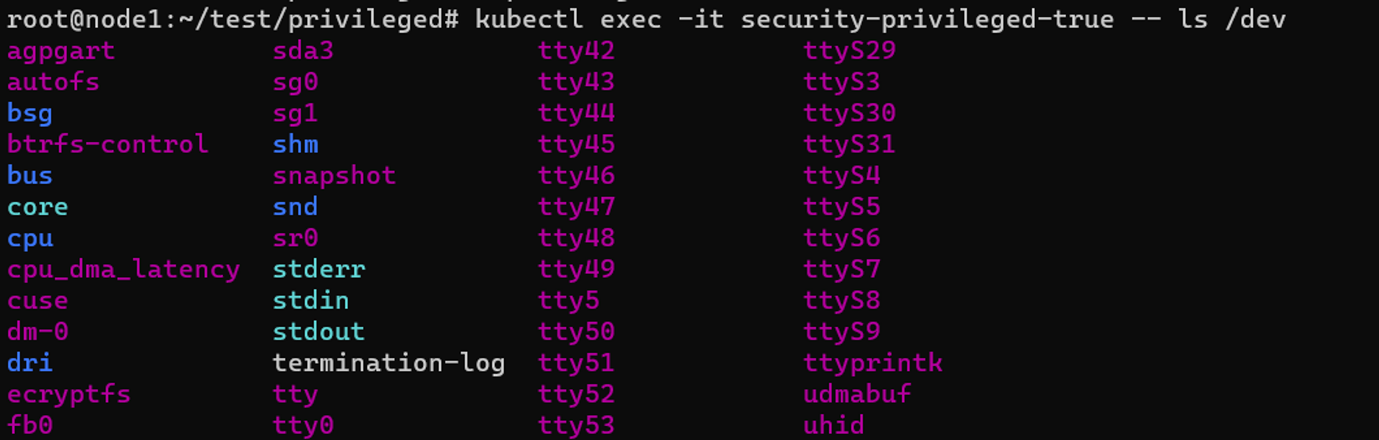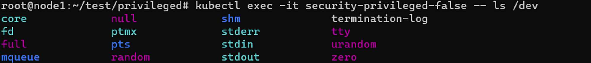 실습에서는 privileged 설정 여부에 따라 노드 디바이스 목록을 조회하는 예제를 살펴보겠습니다. 만약 privileged 설정이 true로 되어 있다면, 해당 pod는 노드 디바이스에 접근할 수 있게 됩니다.