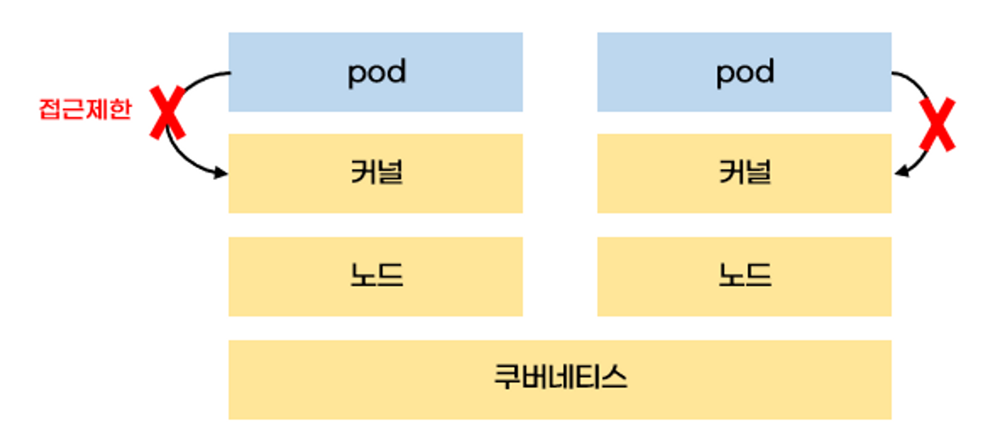 컨테이너는 프로세스로서 노드 커널 위에 실행됩니다. 그러므로 컨테이너가 커널에 접근할 수 있습니다. 쿠버네티스와 같은 컨테이너 오케스트레이션 도구는 pod가 노드 커널에 접근하지 못하도록 보안설정을 합니다.