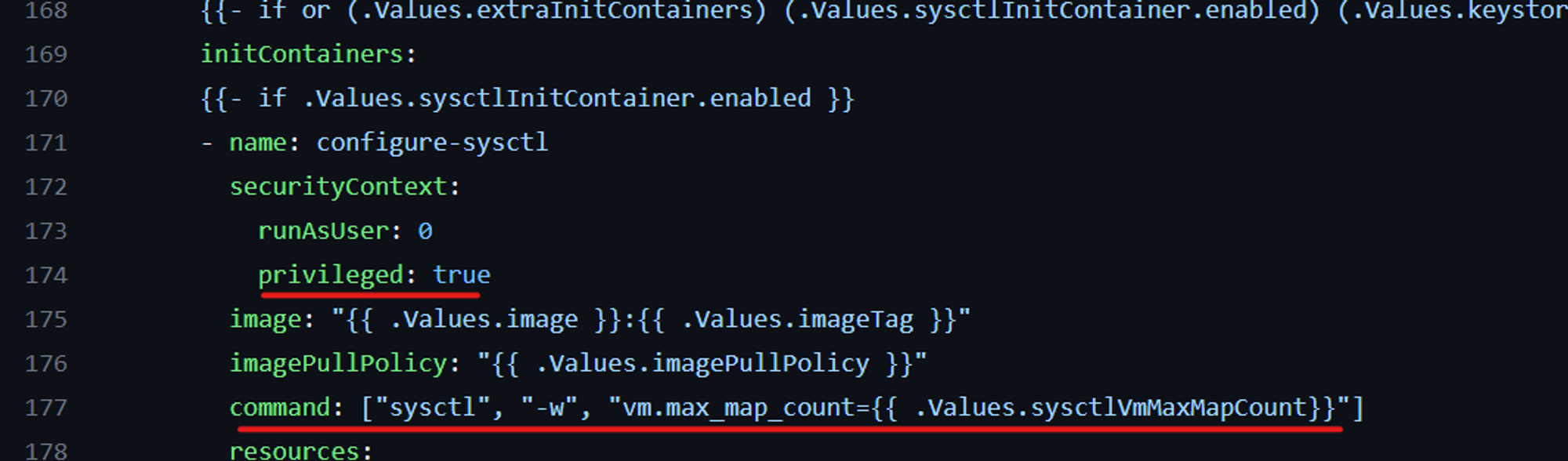 elasticsearch도 노드 커널 파라미터를 수정하기 위해 privileged가 true로 설정되어 있습니다.