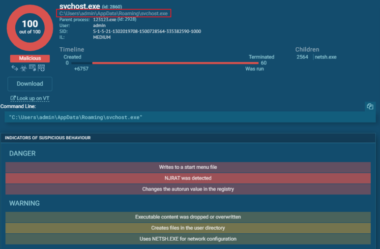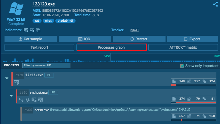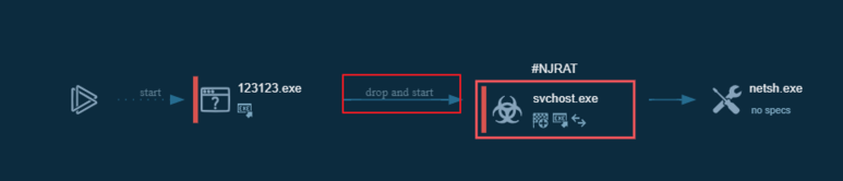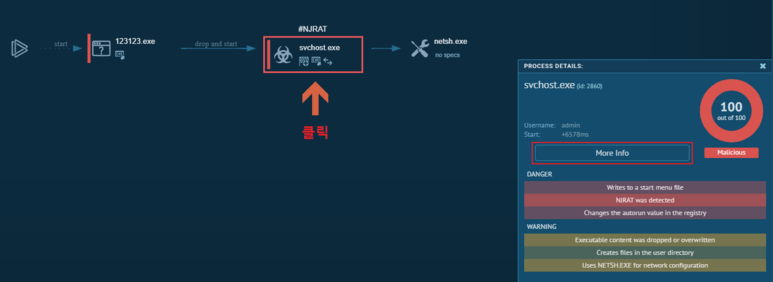 [그림 6]에서 svchost.exe 위를 자세히 보시면 NJRAT라는 태그가 보입니다. 애니런 샌드박스가 svchost.exe를 nrjat악성코드라고 판단한 것입니다. 123123.exe는 태그가 없는 것을 보아 njrat가 아니라 악성코드를 생성하는 드로퍼(Dropper) 또는 로더(Loader)역할을 하는 것이죠.