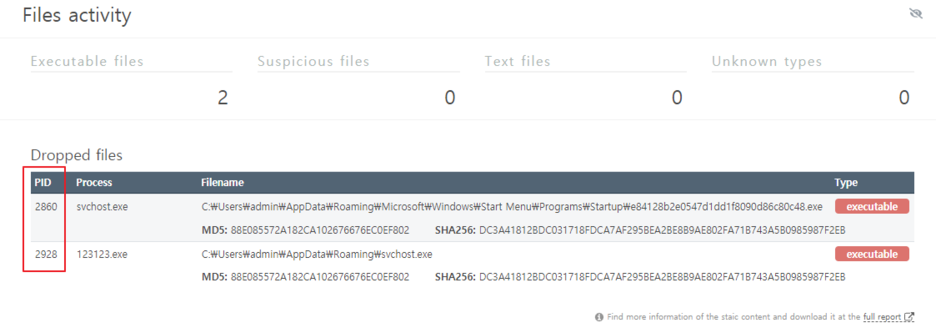 스크롤을 아래로 내리면 파일활동(Files activity)를 볼 수 있습니다. 총 2줄이 보이므로 총 2개의 파일이 생성되었습니다. 각 생성된 파일의 프로세스아이디가 다르므로 어떤 프로세스가 어떤 파일을 생성했는지 직접 확인해봐야 합니다.