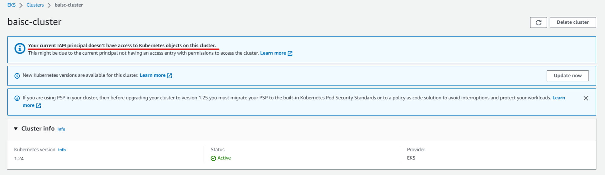 주의사항은 AWS Administrator policy를 갖더라도 EKS를 생성한 계정이 아니면 EKS대시보드 정보가 제한적으로 조회됩니다.