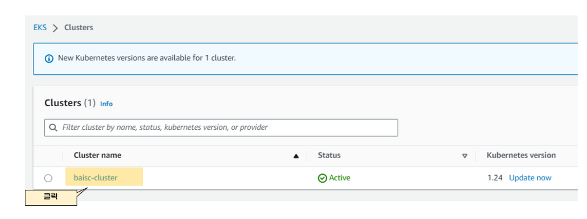EKS대시보드에는 현재 EKS목록을 보여줍니다. EKS 정보를 더 알고 싶으면 원하는 클러스터를 클릭하면 됩니다.