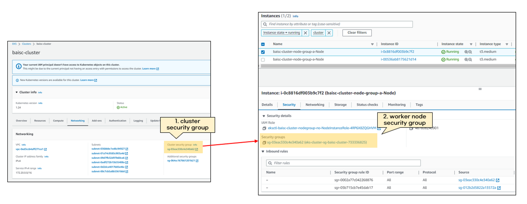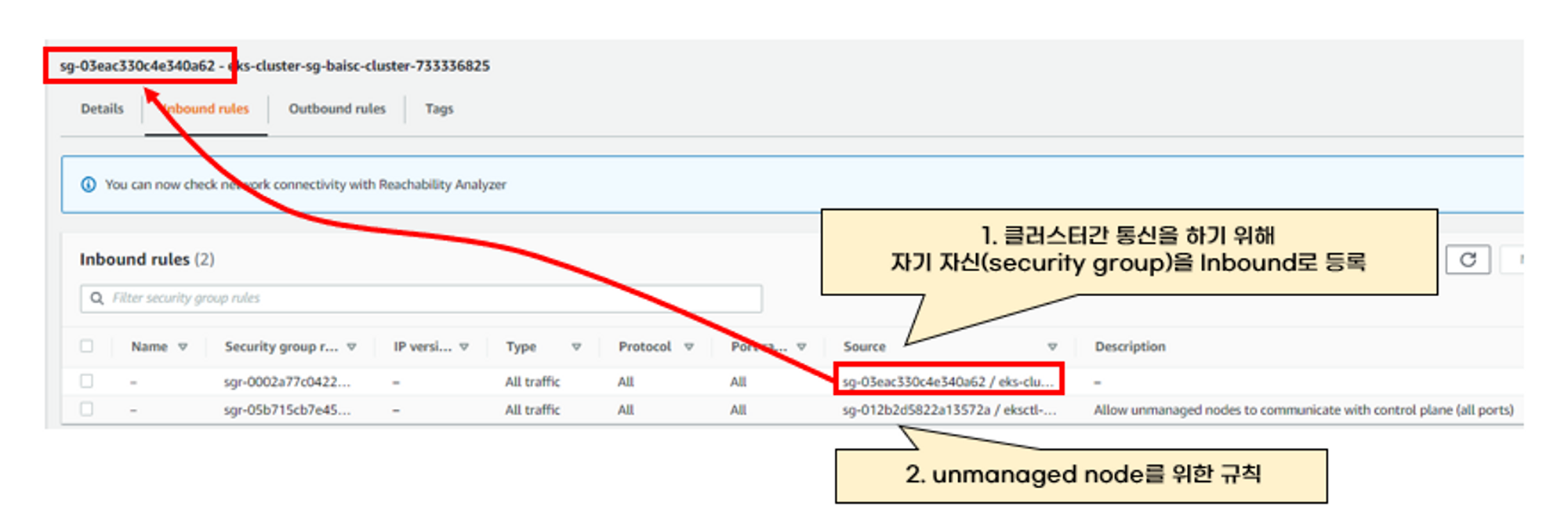 cluster security group은 2가지 규칙이 디폴트로 설정되어 있습니다. 첫 번째 규칙은, 클러스터간 통신을 위한 규칙입니다. 두 번째 규칙은 unmanaged node를 위한 규칙입니다.
