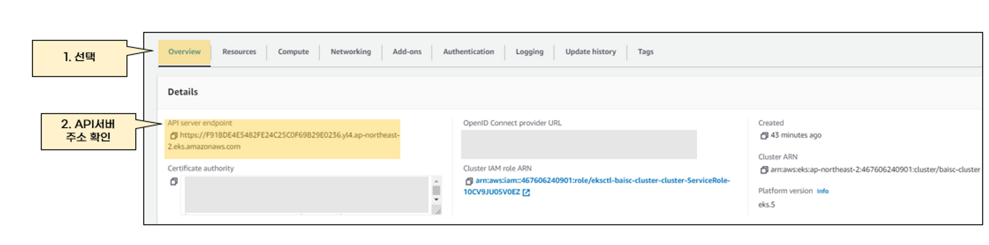 - VPC는 AWS VPC를 설정합니다. VPC설정에 AWS Subnet이 설정됩니다. 그리고 클러스터 네트워크 정보가 설정됩니다.