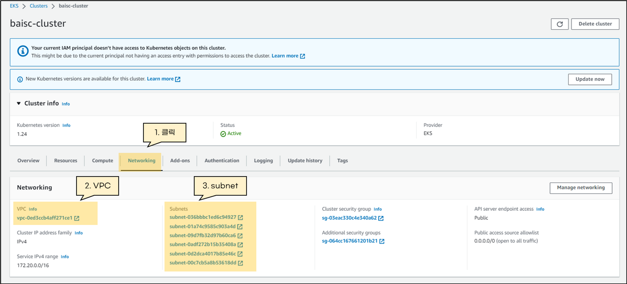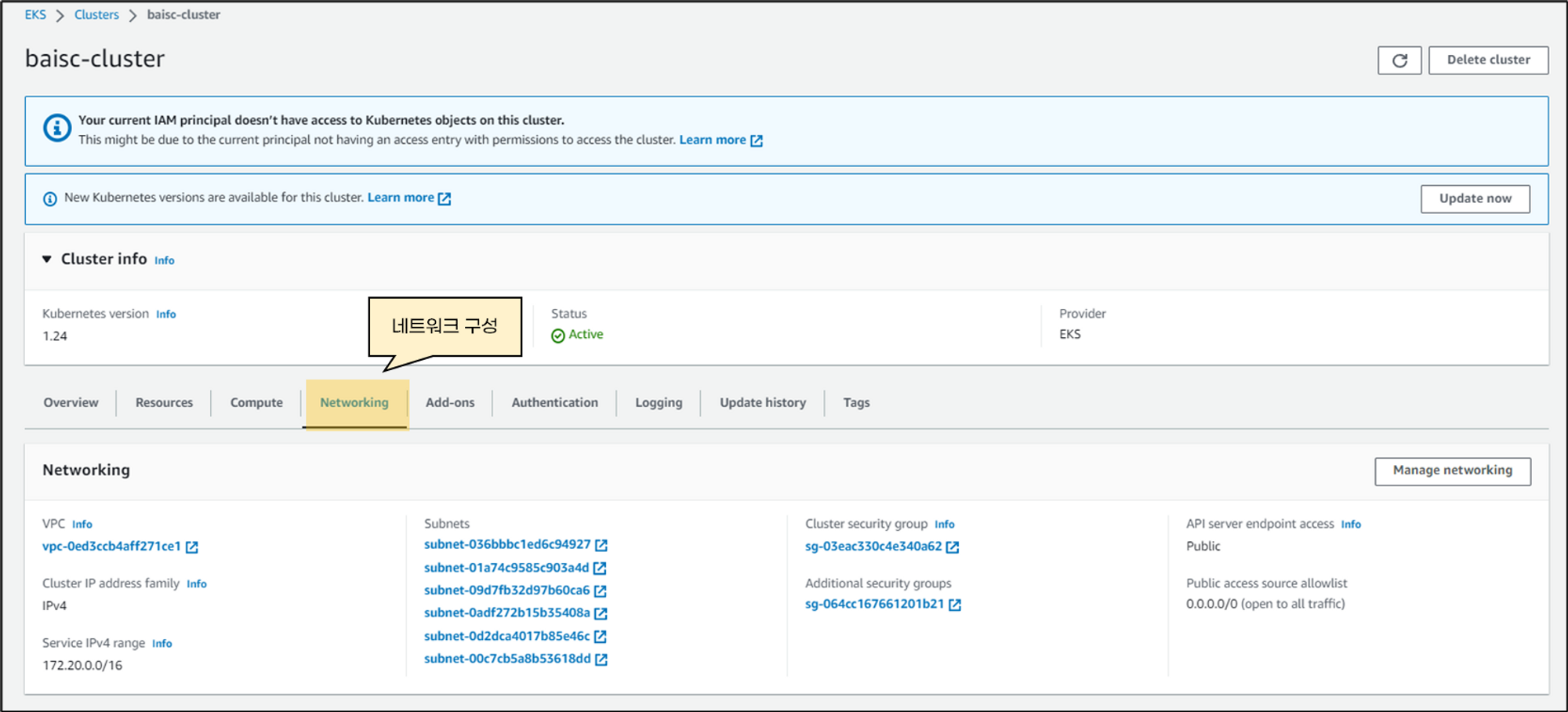 EKS가 사용하는 VPC와 Subnet정보는 “Networking”탭에서 확인할 수 있습니다.
