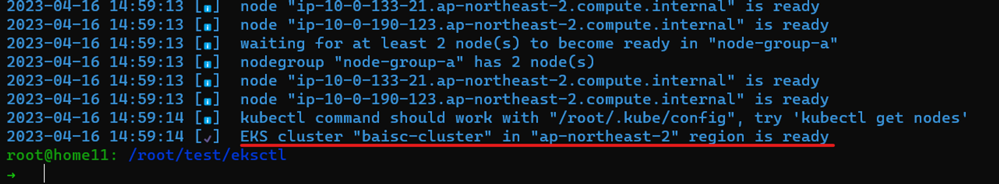설치시간은 약 15분정도 소요됩니다. 정상적으로 설치되 “EKS cluster … ready”라는 메세지가 출력됩니다.