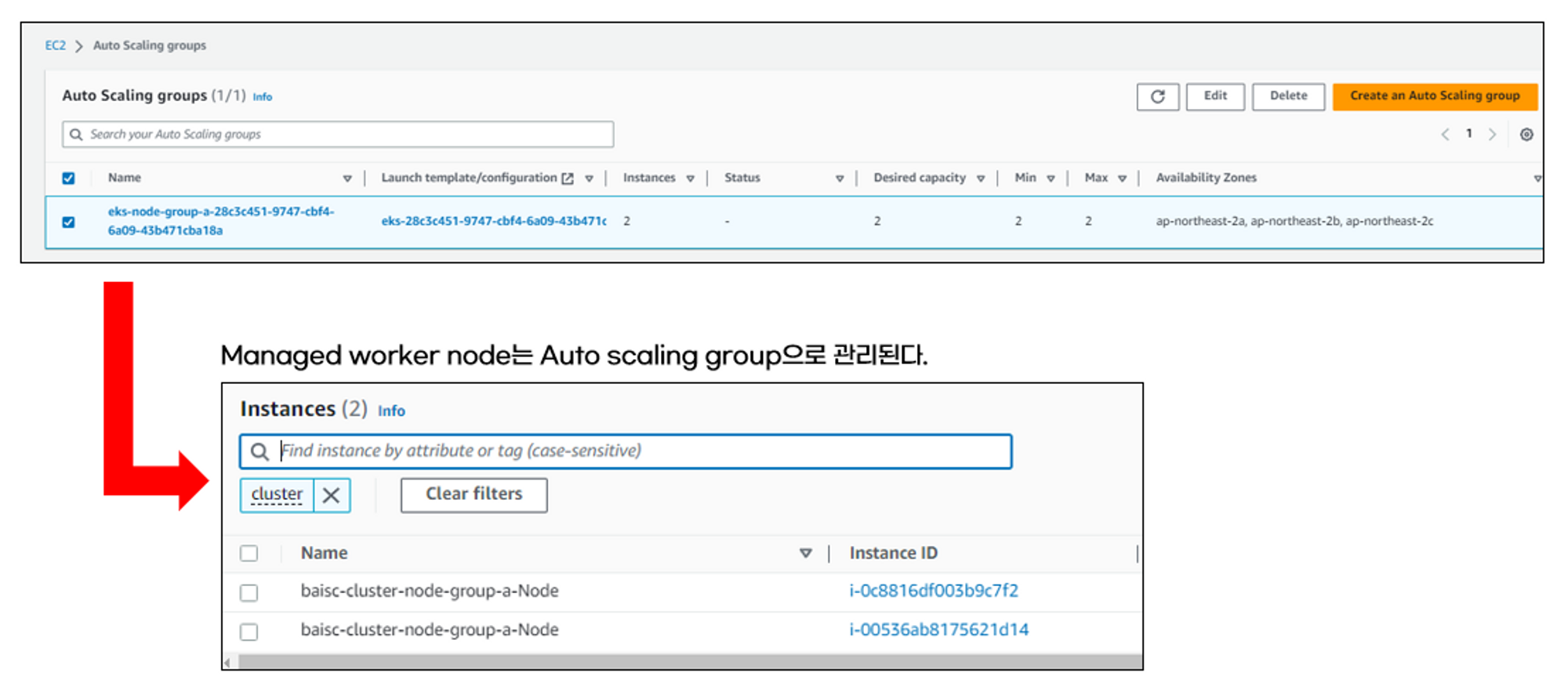 따라서, 이 예제에서 생성한 EKS 워커노드는 auto scaling group으로 생성된 EC2 인스턴스입니다.