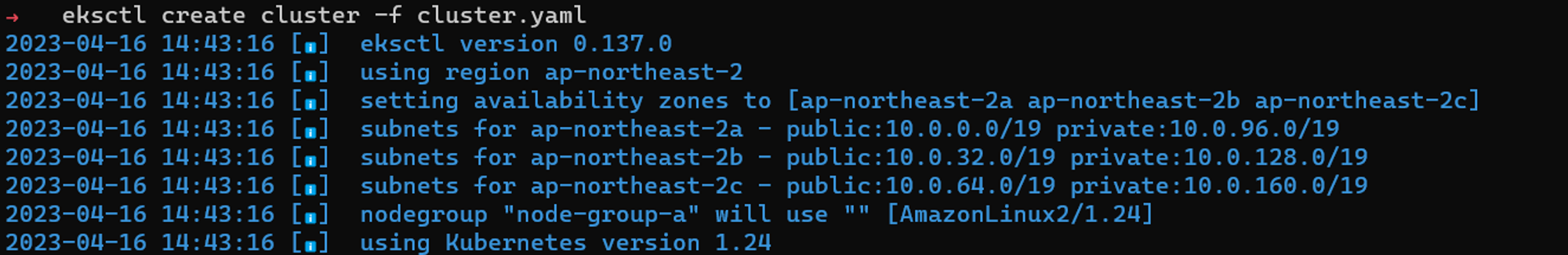 eksctl create cluster -f cluster.yaml