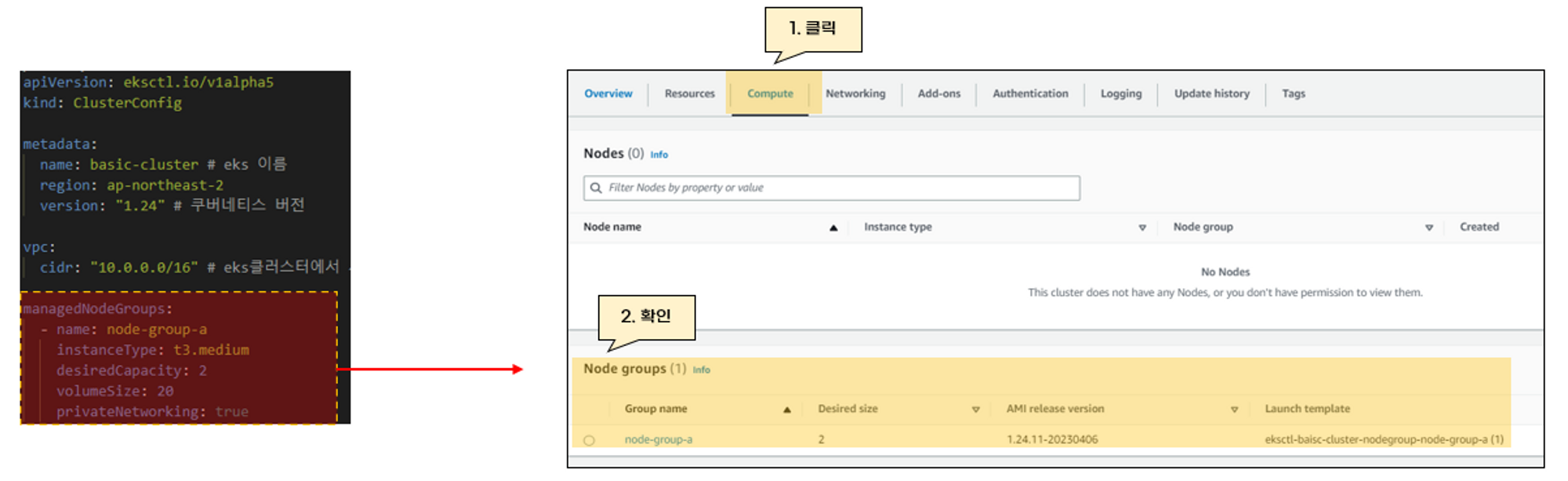 이 예제에서 EKS를 설치할때, managedNodeGroups이 추가되었습니다.