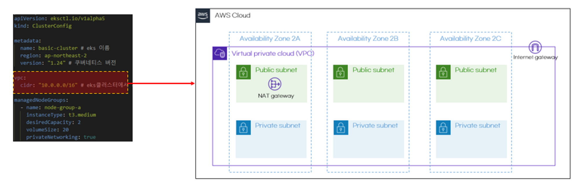 cidr: "10.0.0.0/16" # eks클러스터에서 사용할 VPC의 CIDR