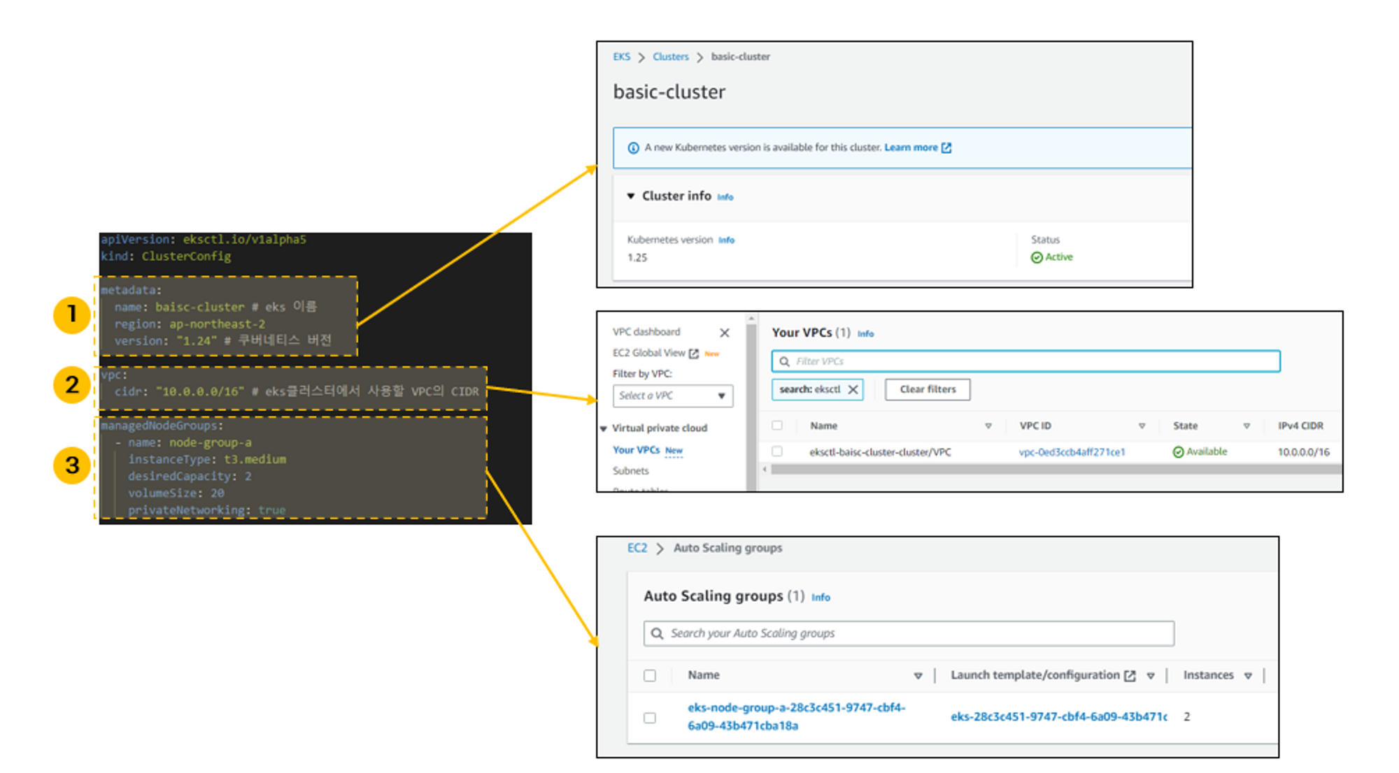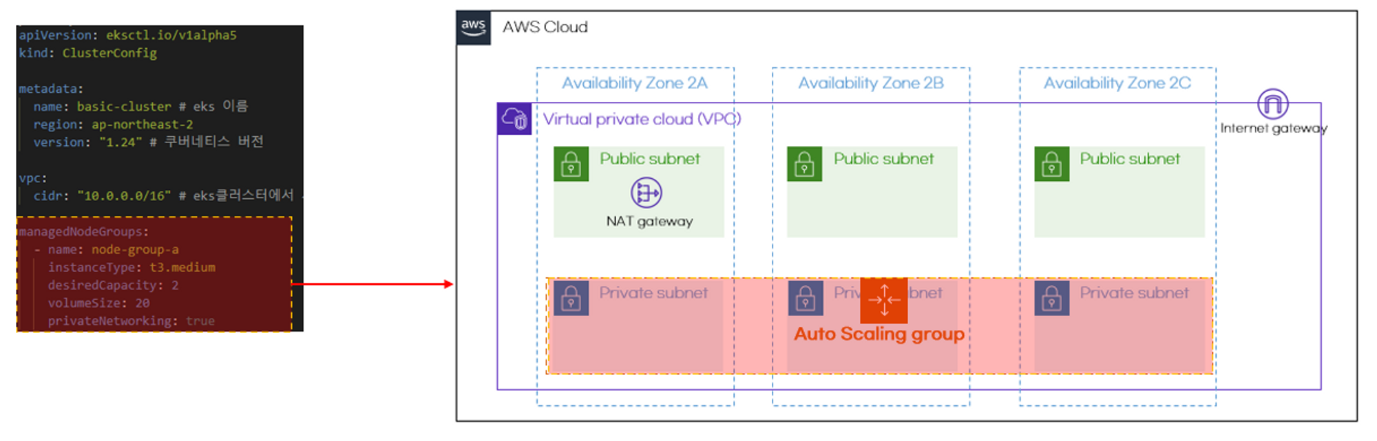 설정파일은 EKS메타정보, 네트워크(VPC), 워커노드(Auto Scaling group)으로 구성됩니다.