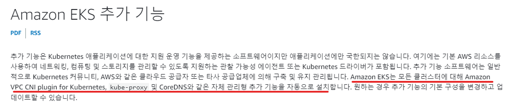 EKS가 설치되면 쿠버네티스 네트워킹을 위한 pod가 자동으로 생성됩니다. 관련된 내용은 EKS애드온 공식문서를 참조하시길 바랍니다.