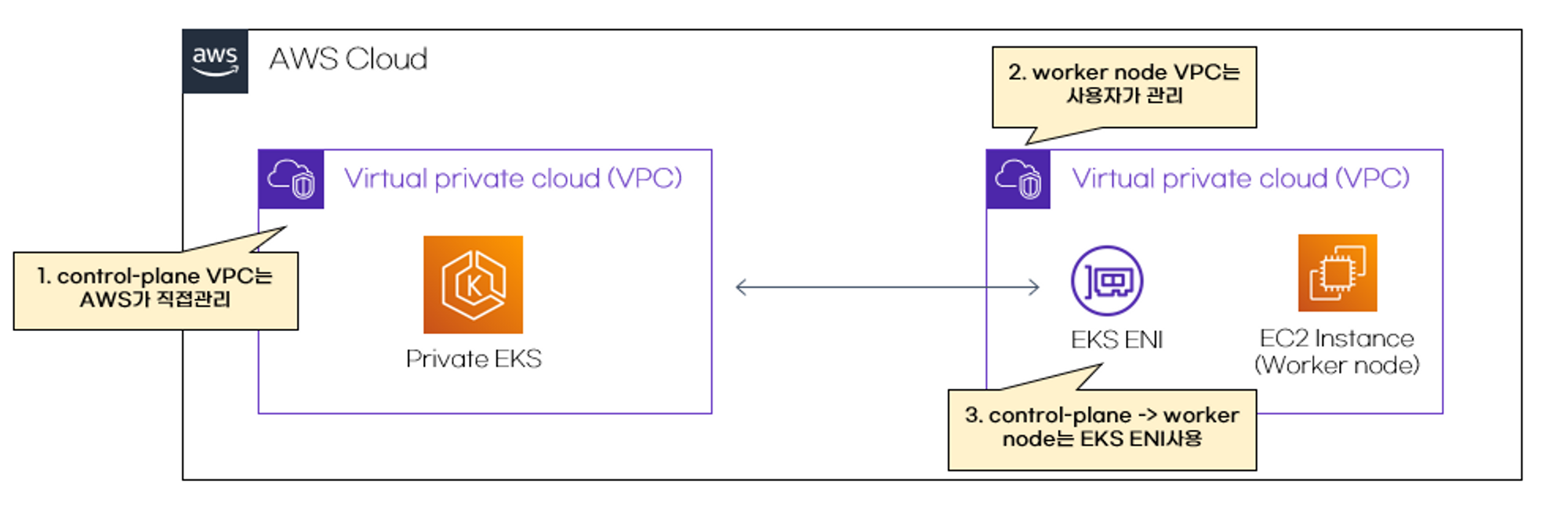control-plane VPC는 AWS가 직접관리하고 worker node VPC는 사용자가 관리합니다. 그리고 control-plane이 worker node에 접근할 때 미리 만들어 놓은 EKS ENI를 사용합니다.