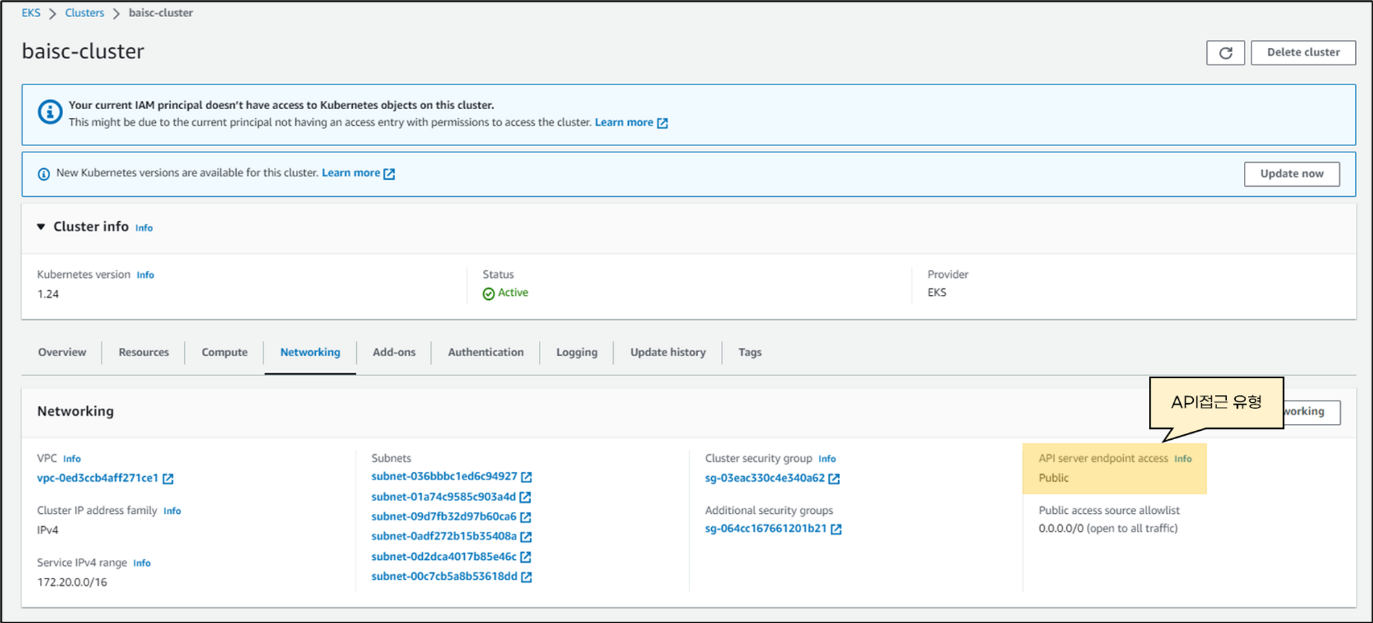 EKS API server접근 유형은 “Network”탭에서 확인할 수 있습니다. default는 public으로 설정되어 있어 누구나 외부에서 EKS API server에 접근할 수 있습니다.