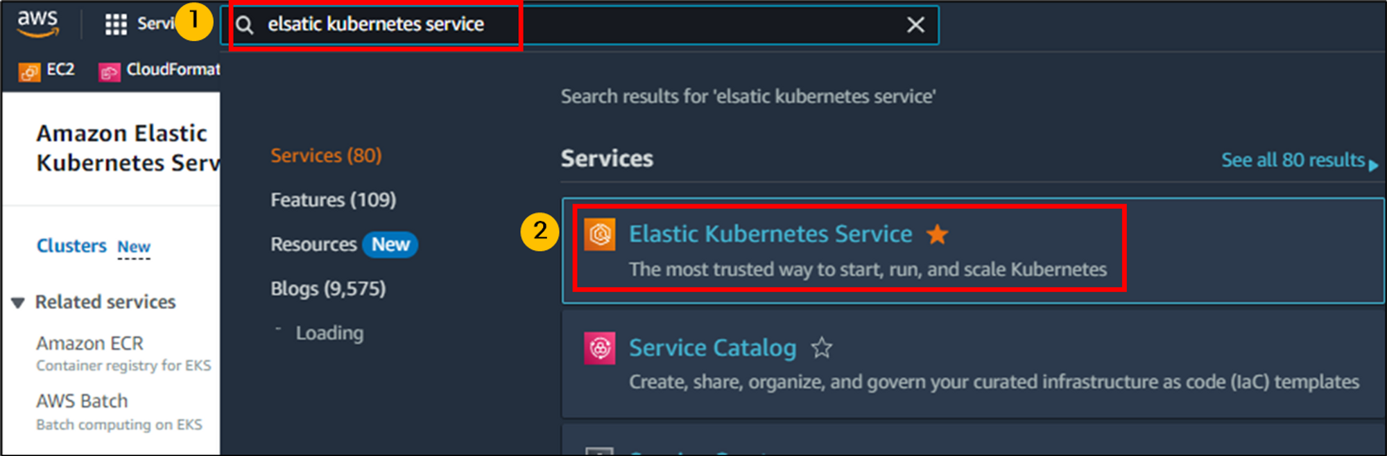 EKS대시보드는 AWS console에서 “Elastic kubernetes Service”에서 볼 수 있습니다.