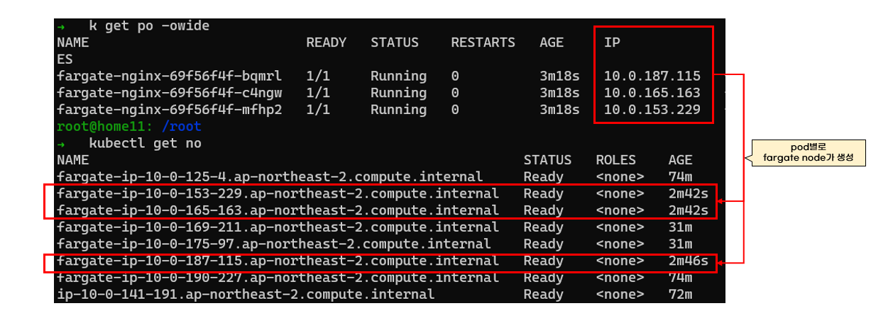 예를 들어 fargate profile 조건에 맞는 pod를 3개 생성하면, fargate node도 3개 생성됩니다.