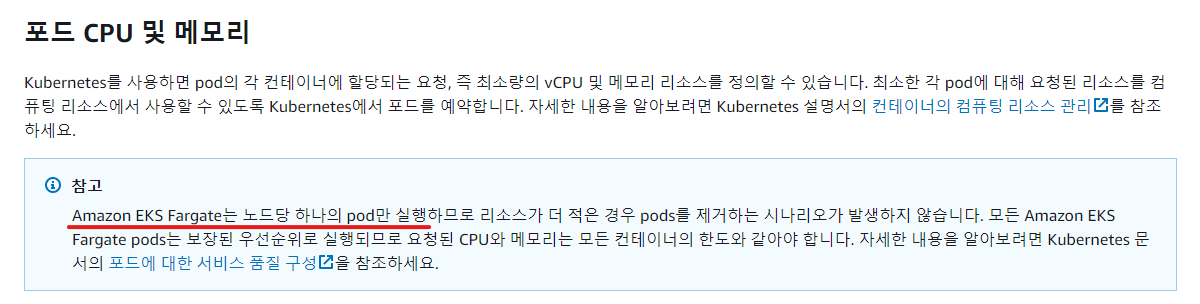 두 번째 장점은 fargate node마다 pod가 사용할 자원만 할당할 수 있어 node운영 비용을 절약할 수 있습니다. fargate node는 1개의 pod만 가질 수 있으므로 pod만 사용할 cpu/memory만 node에 할당하면 됩니다. 그러므로 비용을 아낄 수 있는 상황이 많이 접하게될 것 같습니다.