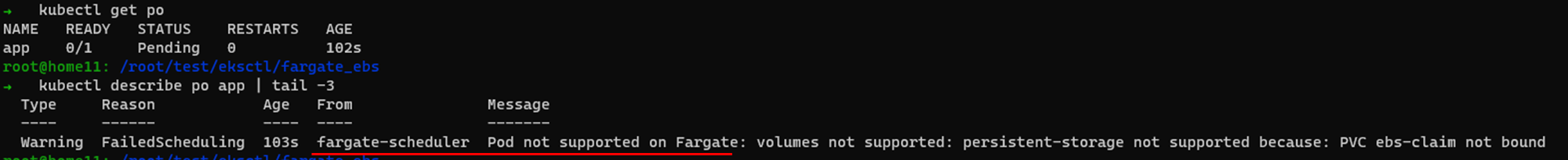 EKS pod에서 EBS를 사용하려면 csi-node daemonset이 해당 node에 실행되야 합니다. 하지만, fargate node는 daemonset을 실행하지 못하므로 EBS 스토리지를 사용할 수 없습니다. 아래 예제는 fargate node에서 실행한 pod가 EBS 스토리지를 사용하려니 bound에러가 발생합니다.
