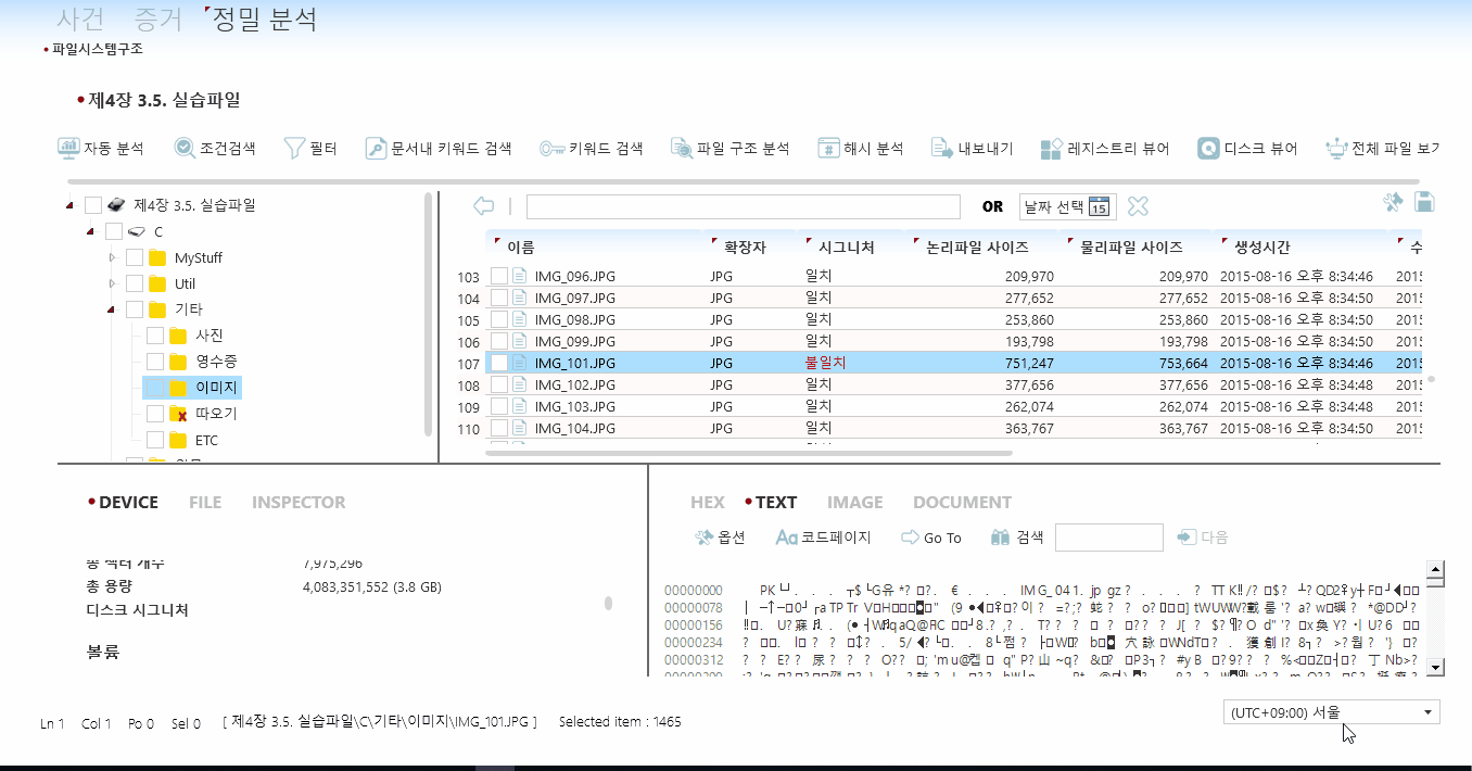5번 문제(책 페이지 319)를 예제로 살펴보자. 아래 gif에서 보이는 것처럼 IMG_101.jpg의 [파일 구조 뷰어]를 처음 진입하면, 해시가 보이지 않는다. [해시 분석]이후에 다시 해당 경로에 진입하면 해시가 보여진다.