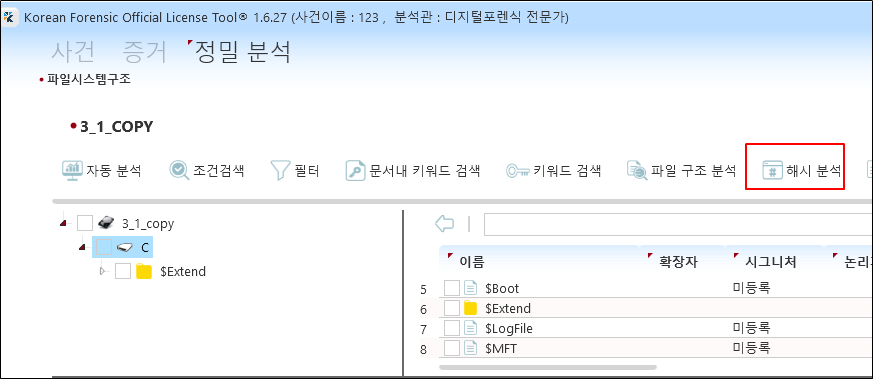 KFOLT에서 분석한 파일의 해시는 기본으로 표시되지 않는다. 해시를 분석하기 위해 [해시 분석]이라는 메뉴를 클릭한다. 주의 사항은 해시 표시가 바로 적용되는 것이 아니라 다른 디렉터리를 방문하고 다시 원하는 경로로 이동해야 한다.