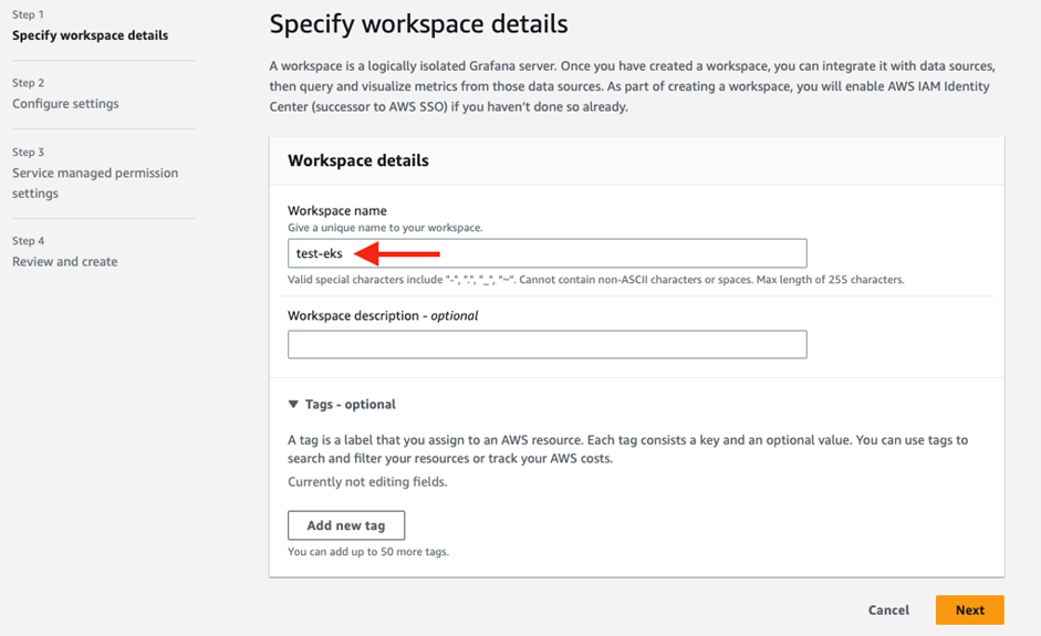 AMG는 워크스페이스 단위로 구분합니다. 워크스페이스는 그라파나 인스턴스라고 생각하시면 됩니다.