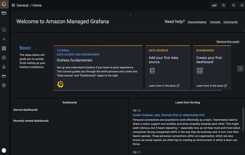 등록한 AWS SSO계정으로 AMG로그인을 하면 그라파나 홈페이지가 보입니다.