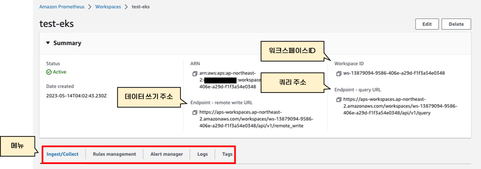 워크스페이스를 생성하면 AMP주소가 자동으로 생성됩니다. 사용자는 AMP주소를 사용하여 메트릭 저장과 쿼리를 실행합니다.