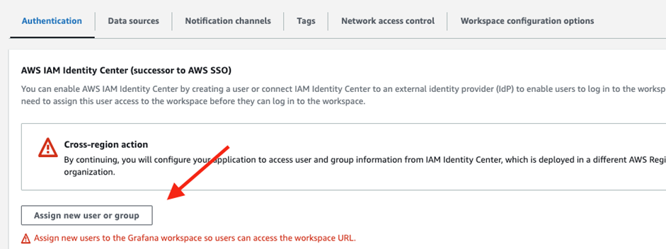AWS SSO계정은 AMG Authentication메뉴에서 관리합니다. 로그인 계정을 생성하기 위해 Assign new user or group버튼을 클릭합니다.