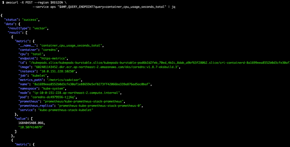 --service aps "$AMP_QUERY_ENDPOINT?query=container_cpu_usage_seconds_total" | jq