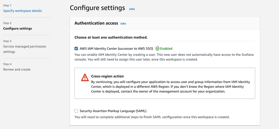 AMG 워크스페이스를 생성할 때, 인증/인가 방법을 선택하는 과정이 있습니다. AWS IDentity Center를 사용하면 AWS SSO를 사용합니다. SAML를 사용하면 타사 SAML provider 연동이 가능합니다.