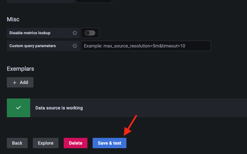설정을 마치고 Save&Test버튼을 클릭합니다. AMP연결이 잘 된다면 “Data source is working”메세지가 표시됩니다.
