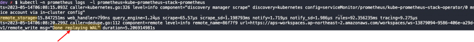 프로메테우스 로그를 확인합니다. 프로메테우스가 수집한 메트릭을 AMP에게 성공적으로 전달하는지 로그로 확인가능합니다.