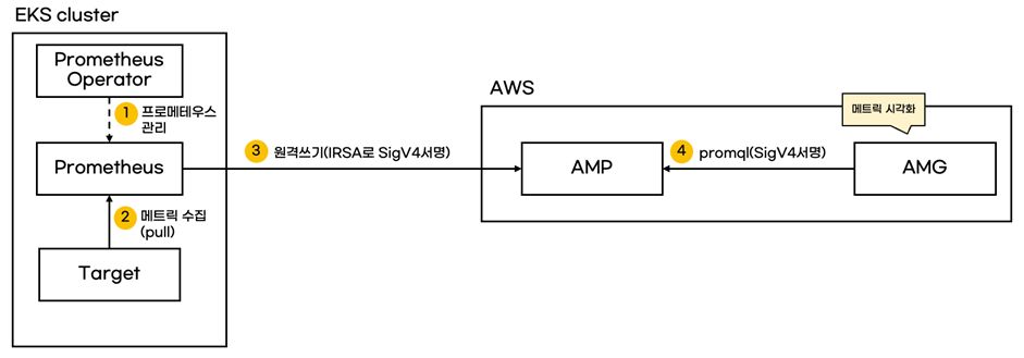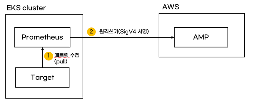AMP 원격쓰기(remote write)를 사용하여 EKS 메트릭을 AMP에 저장할 수 있습니다. AMP가 EKS 메트릭을 직접 수집하지 않습니다. 그 대신, EKS에 프로메테우스를 직접 설치하여 메트릭을 수집해야 합니다. 그리고 프로메테우스는 수집한 메트릭을 원격쓰기를 사용하여 AMP에게 전달합니다.