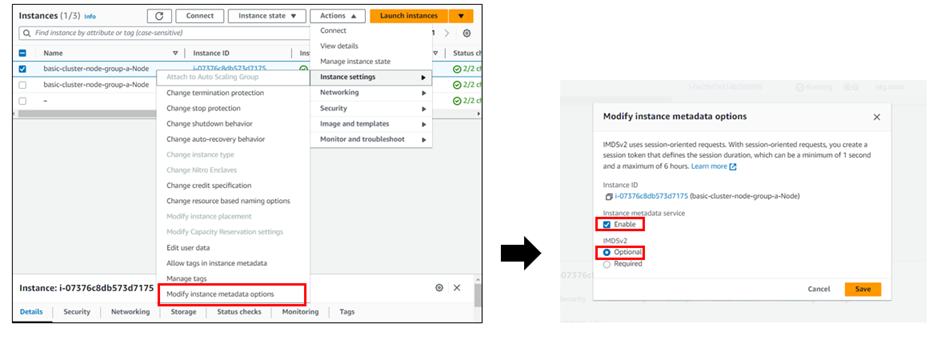 IMDS API(Instance Metadata Service)는 EC2 메타데이터를 조회하는 API입니다. EC2인스턴스에서 IMDS API를 호출할 수 있습니다. EKS 워커노드를 EC2인스턴스로 사용하면, pod또한 IMDS API를 사용할 수 있습니다. IMDS API는 옵션으로 활성화/비활성화 합니다.