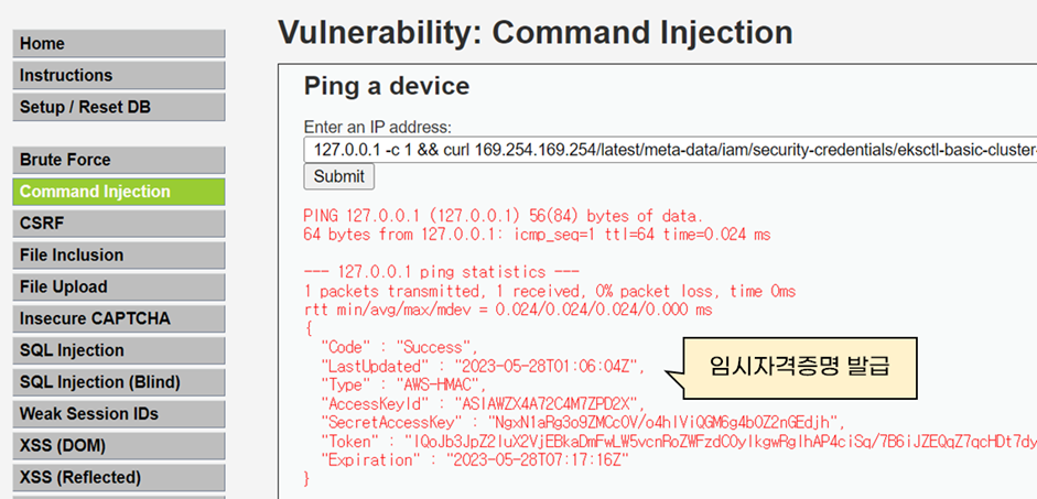 시나리오는 취약한 웹 애플리케이션 pod에서 임시자격증명을 발급받고 S3를 조회합니다.