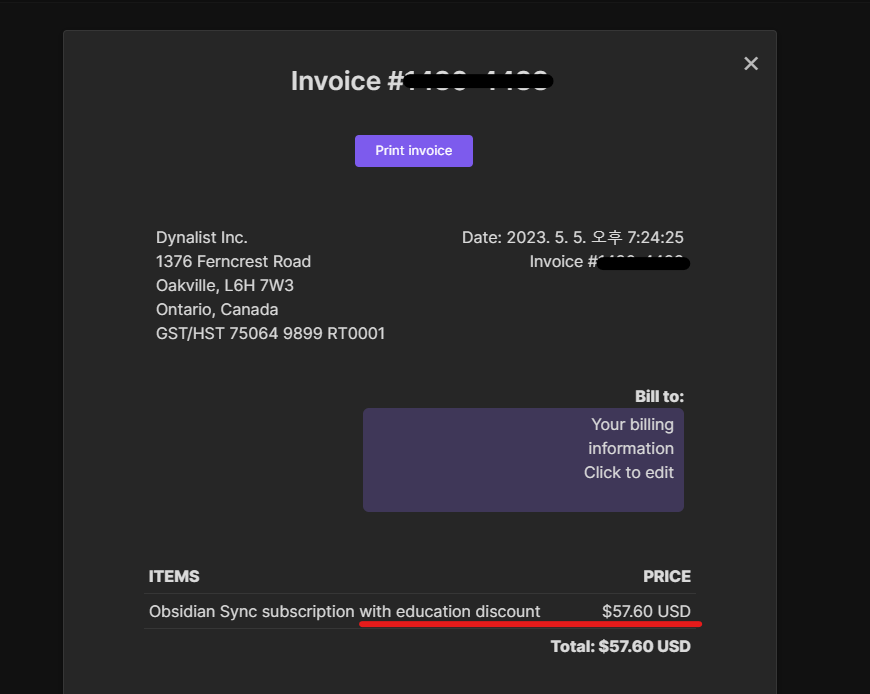 obsidian sync 1년치를 구독했습니다. 약 $57비용이 들었네요. 졸업한 학교의 학생메일을 사용해서 할인받았습니다.