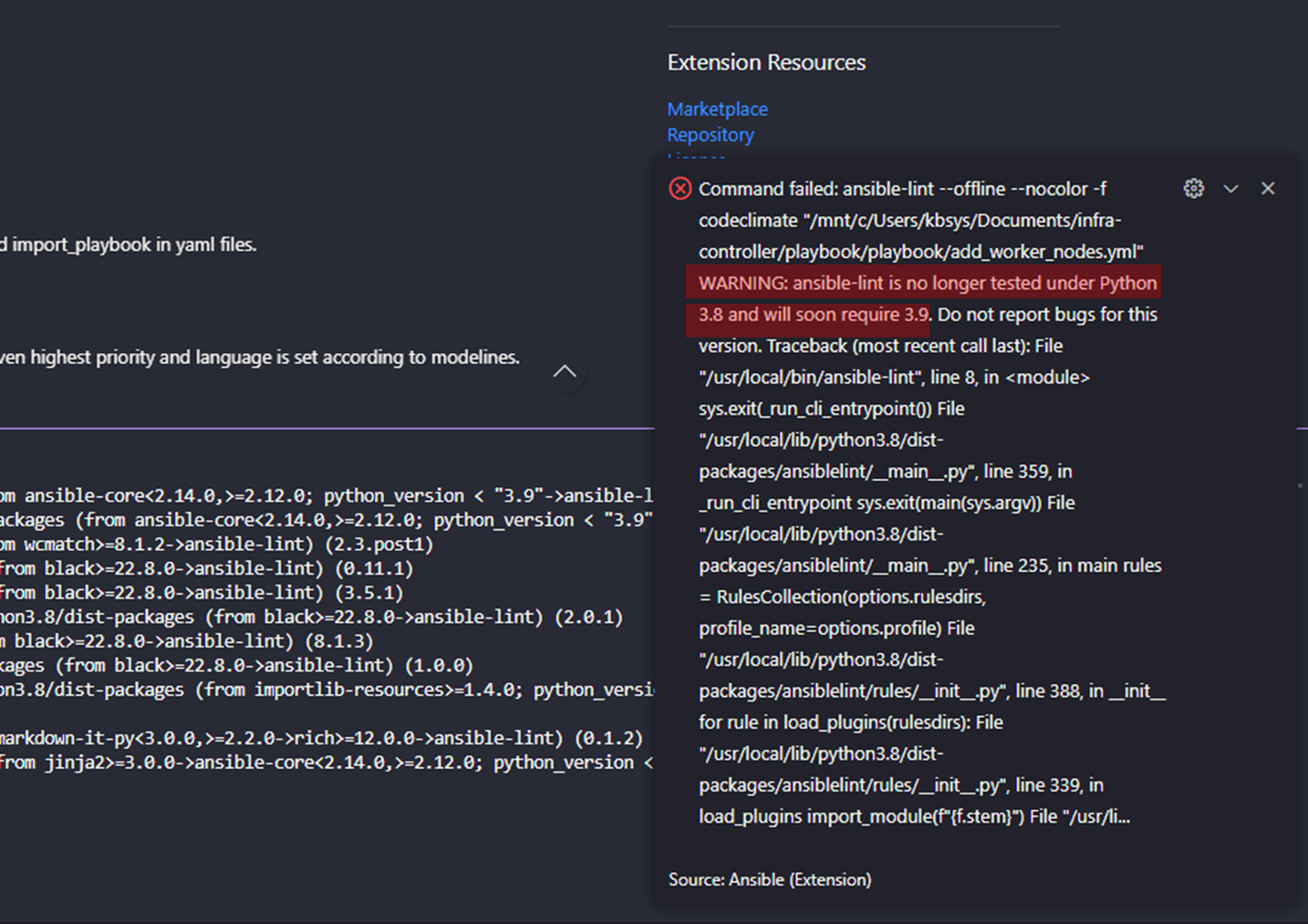 찾아보니 최신버전 ansible extension은 python 3.8이하는 더 이상 지원을 하지 않은 것 같네요. ㅜ.ㅜ