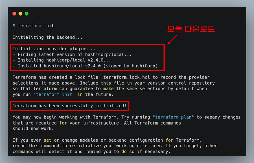 테라폼 코드를 실행하기 위해 초기화 과정이 필요합니다. 초기화 과정은 테라폼 코드가 사용하는 모듈을 다운로드 받습니다.