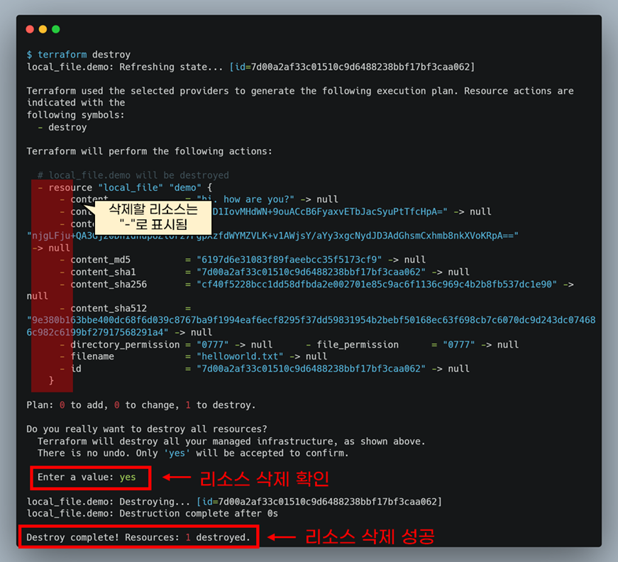 테라폼으로 생성한 리소스는 테라폼으로 삭제할 수 있습니다. terraform destroy명령어를 실행하면 리소스를 삭제합니다. 삭제할 리소스는 -로 표시됩니다. 삭제 확인 프롬프트가 나오면 yes를 눌러야 리소스가 삭제됩니다.