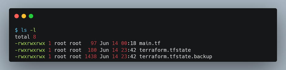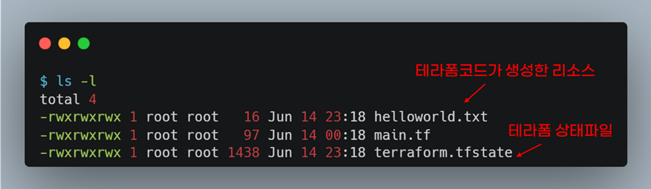 테라폼 코드 실행 후 파일 목록을 확인해보세요. helloworld.txt파일과 tfstate파일이 생성되었습니다. tfstate파일은 다른 챕터에서 설명합니다.