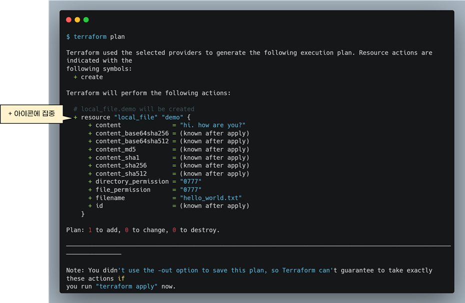 +버튼이 있는 줄은 테라폼 코드 실행 후, 해당 리소스가 새로 생성된다는 의미입니다. 아직 helloworld.txt 파일이 없으므로 +버튼이 많이 보입니다.
